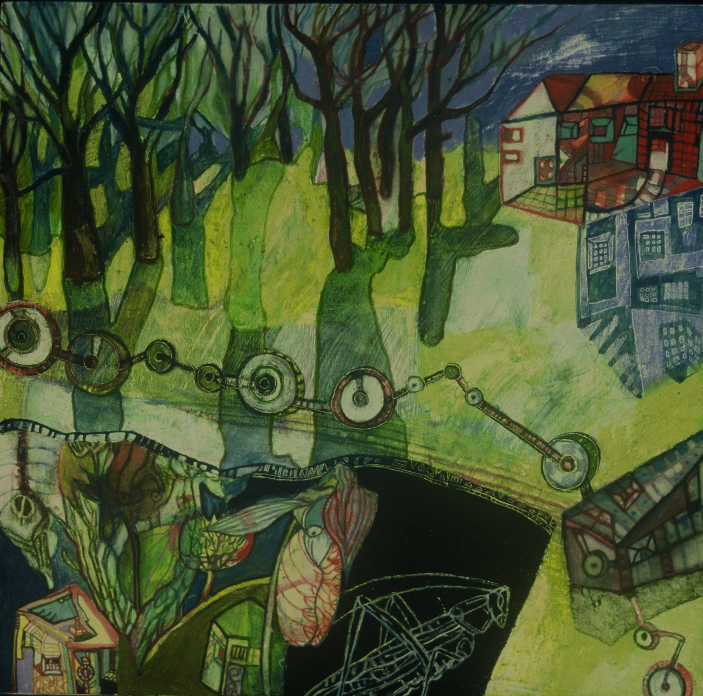 oil paint, oil pastel, beeswax, collaged drawings, on wood
